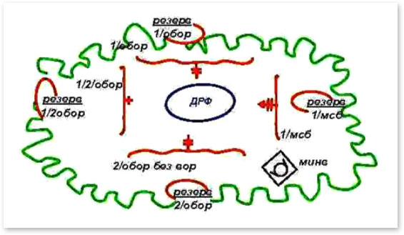 Քանի որ, կախված տեղանքից, շրջապատման գիծը կարող է նվազել, հնարավոր է որոշ ստորաբաժանումներ հետ քաշել շրջապատման գծից դեպի ռեզերվ: Հակառակորդի փոքր ուժերի դեմ գործողությունների դեպքում ամբողջ շրջափակման տարածքը կարող է մաքրվել սեղմումով, սակայն, մեծ ուժերի դեմ գործելու դեպքում կպահանջվի այլ մեթոդների կիրառում (նկ. 1).